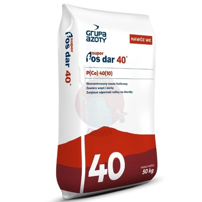SUPER FOS DAR 40 - SUPERFOSFAT WZBOGACONY 40% P2O5 Jest zaliczany do grupy najbardziej skoncentrowanych nawozów fosforowych. Zawartość w nawozie fosforanu jednowapniowego rozpuszczalnego w wodzie czyni fosfor łatwo przyswajalnym dla roślin. Nawóz ten dodatkowo w swoim składzie zawiera składniki potrzebne roślinom takie jak: wapń (całkowity) w ilości 10 % (CaO) i siarkę. Zawartości składników pokarmowych: