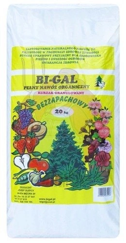 - Nawóz organiczny BI-GAL produkt w pełni naturalny, produkowany w nowoczesnej fermie kur z wykorzystaniem najnowszych technologii. BI-GAL powstaje w wyniku suszenia i granulacji obornika kurzego wyłącznie naturalnymi metodami, bez chemicznych dodatków.