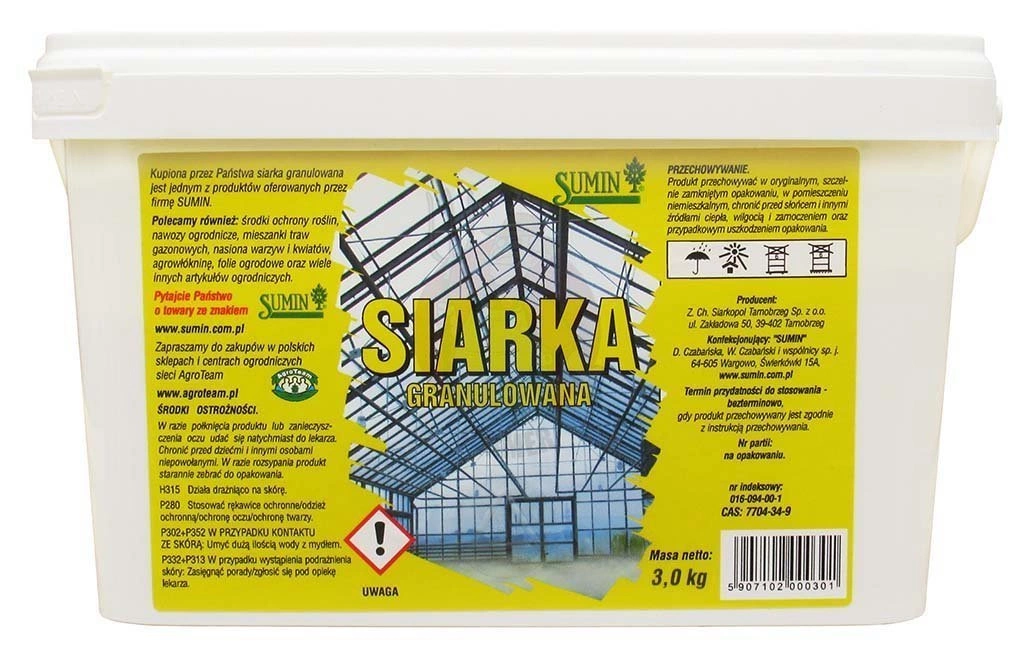 Siarka jest pierwiastkiem rozpowszechnionym w przyrodzie i jako składnik aminokwasów siarkowych spełnia bardzo ważne funkcje w kształtowaniu jakości białka roślinnego. Siarka granulowana działa wolno i aby była w pełni skuteczna przy zakwaszaniu gleby, musi upłynąć trochę czasu od aplikacji. Stosując małe dawki w okresie jesiennym, rośliny na zakwaszanym polu mogą być sadzone wiosną.