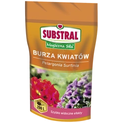 Nawóz Substral Magiczna Siła Burza Kwiatów. Specjalistyczny nawóz interwencyjny do pelargonii. Wpływa na obfite kwitnienie dzięki dużej zawartości fosforu i potasu w odpowiedniej proporcji. Wysoko skoncentrowany nawóz, dlatego wystarczy niewielka dawka. Bardzo dobrze przyswajany przez liście i korzenie. 100% rozpuszczalny w wodzie. Prosty w stosowaniu – łączy podlewanie z nawożeniem. Wysoka wydajność - dawka 1g na litr wody.