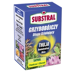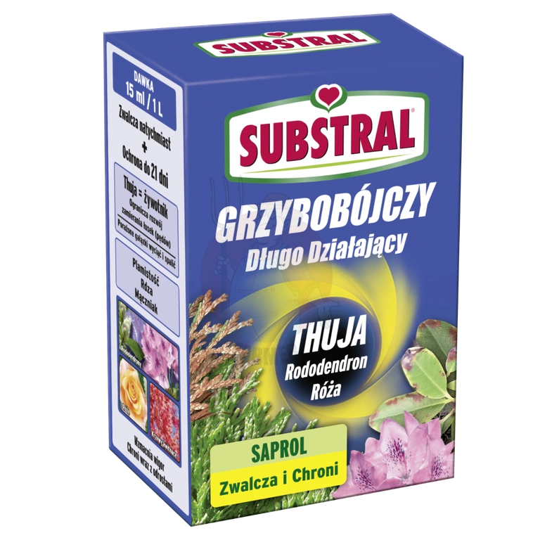 Substral Saprol do Thuj. Długodziałający środek grzybobójczy. Ogranicza występowanie antraknozy i zamieraniem łusek i pędów w thujach i roślinach iglastych. Działa systemicznie - wnika w głąb rośliny i krąży wraz z jej sokami przez okres co najmniej 3 tygodnie. Brak ryzyka wymywania przez deszcz. Chroni roślinę również z nowymi odrostami.