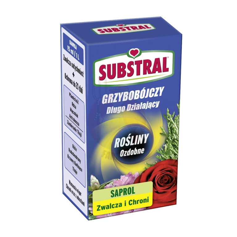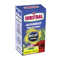 Substral Saprol do Roślin Ozdobnych. Długodziałający środek grzybobójczy stosowany na: krzewach, różach, roślinach zielonych i kwitnących, iglastych. Zwalcza plamistość liści, rdze, mączniaki prawdziwe. Działa systemicznie - wnika w głąb rośliny i krąży wraz z jej sokami przez okres co najmniej 3 tygodnie. Brak ryzyka wymywania przez deszcz.