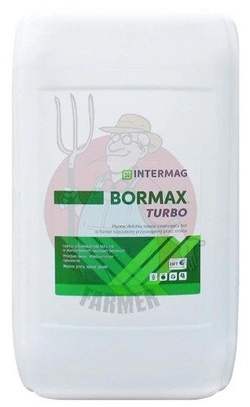 • Bormax Turbo to płynny nawóz dolistny zawierający 150 g boru (B) w 1 litrze w formie boroetanoloaminy wzbogacony w Technologię INT, ułatwiającą pobieranie i przemieszczanie boru w roślinach.
