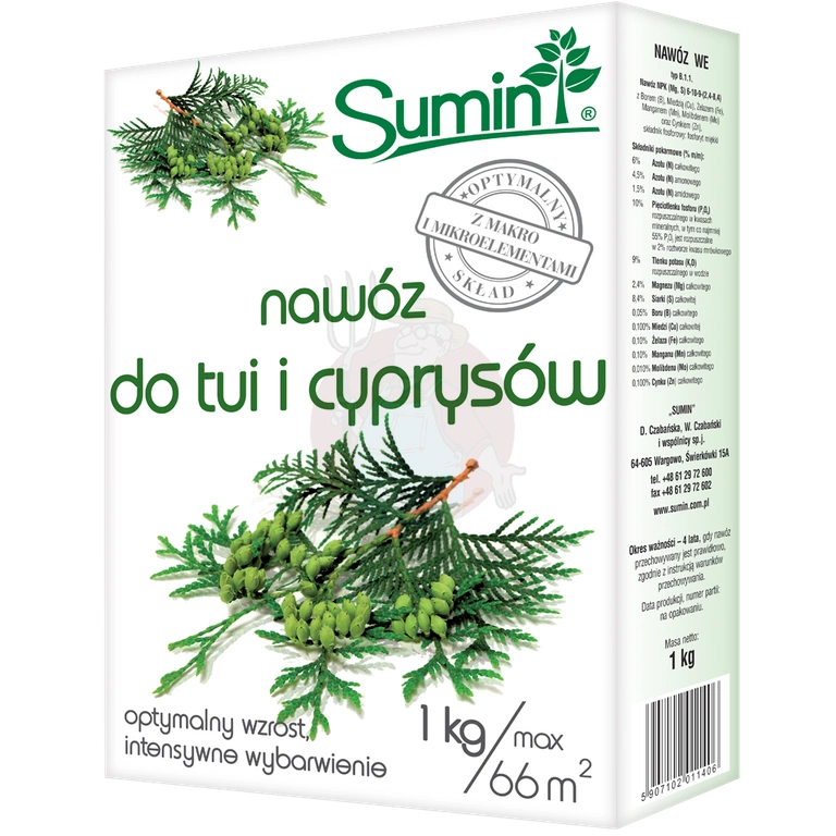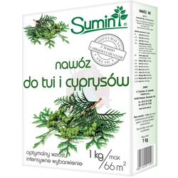 Przed sadzeniem tui (żywotników) i cyprysów ziemię z dołków do sadzenia (o głębokości co najmniej 30 cm), wymieszać z nawozem SUMIN do tui i cyprysów w ilości 50-100 g nawozu na 100 I ziemi (orientacyjna ilość ziemi z jednego dołka o wymiarze 60x60x30 cm). Po zastosowaniu nawozu, jeśli gleba jest niedostatecznie wilgotna, należy podlać ją wodą. Po dobrym przyjęciu się roślin w roku sadzenia należy dokarmić je latem, jednorazową dawką 50-100 g na 1 m2 powierzchni uprawnej wokół roślin.
