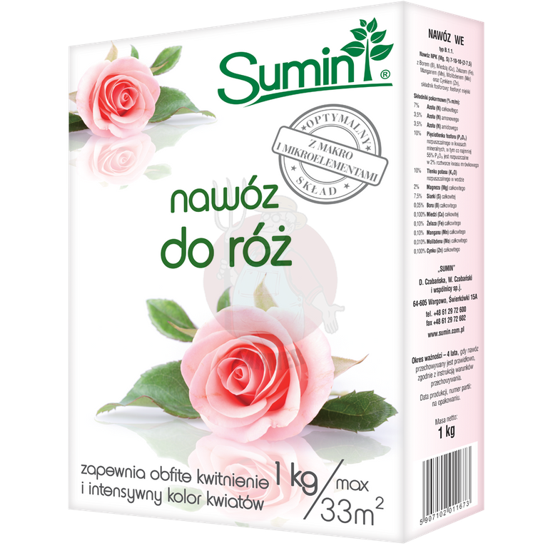 • Nawóz do róż Sumin to granulowany nawóz NPK 7-10-10 z magnezem i mikroelementami. Wspiera obfite kwitnienie, zdrowy wzrost i odporność roślin. Odpowiedni do sadzenia i nawożenia róż w kolejnych latach.