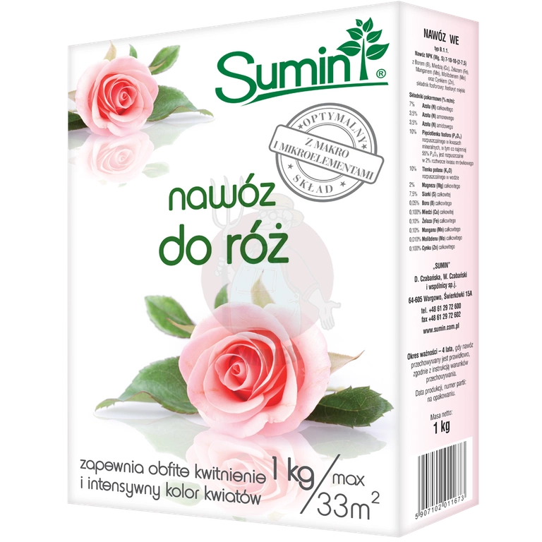 - Nawóz do róż Sumin to granulowany nawóz NPK 7-10-10 z magnezem i mikroelementami. Wspiera obfite kwitnienie, zdrowy wzrost i odporność roślin. Odpowiedni do sadzenia i nawożenia róż w kolejnych latach.