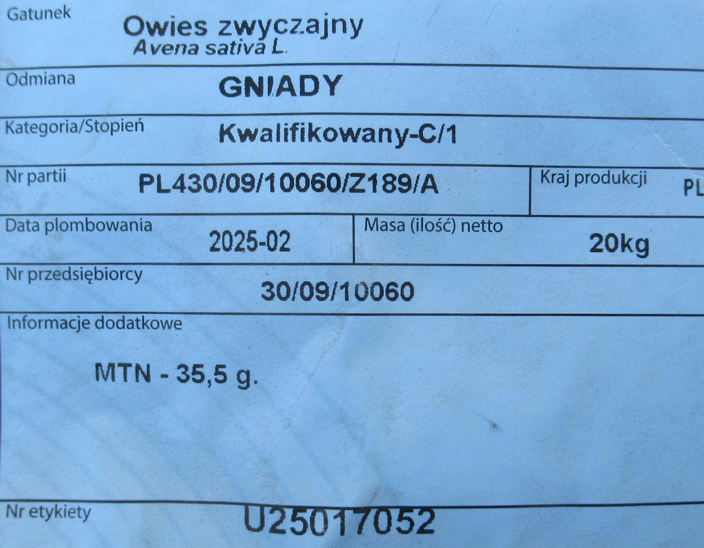 Owies Gniady nasiona kwalifikat C1