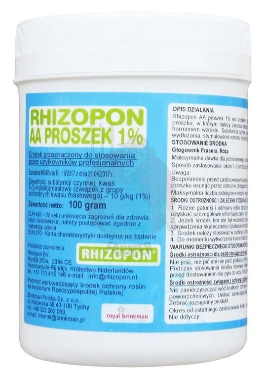 Rhizopon AA proszek 1% jest środkiem z grupy regulatorów wzrostu i rozwoju roślin w formie proszku, w którym należy zanurzać sadzonki. Zawiera syntetyczną auksynę będącą roślinnym hormonem wzrostu. Substancja czynna wpływa na morfologię korzeni poprzez hamowanie ich wydłużania, stymulowanie wzrostu korzeni bocznych i zwiększanie ich liczby.
