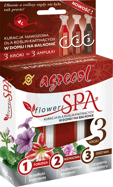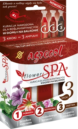 - Flower SPA to zestaw trzech różnych nawozów mineralnych w łatwych w użyciu ampułkach, przeznaczonych dla wszelkich roślin kwitnących.