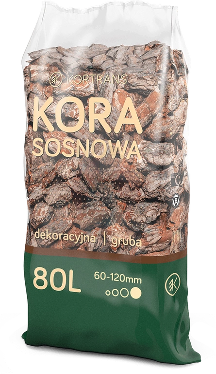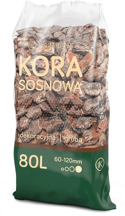 - Kora sosnowa dekoracyjna o frakcji 60-120 mm jest polecana do pielęgnacyjno-dekoracyjnego ściółkowania roślin. Eliminuje ona rozwój chwastów, zatrzymuje wilgoć w glebie oraz ułatwia pielęgnację roślin ozdobnych. Sprawdza się jak finalna ozdoba kompozycji.