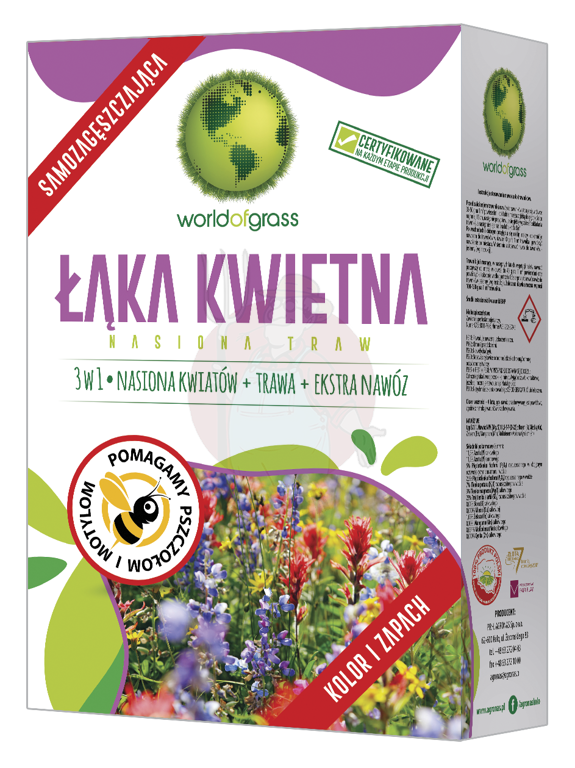 - Łąka kwietna 3w1 – mieszanka traw, kwiatów i nawozu. Dekoracyjna, pachnąca, przyjazna dla pszczół. Wysiew od kwietnia do czerwca. Koszenie raz w sezonie. Zawiera 0,5 kg nasion traw i 0,5 kg nawozu.