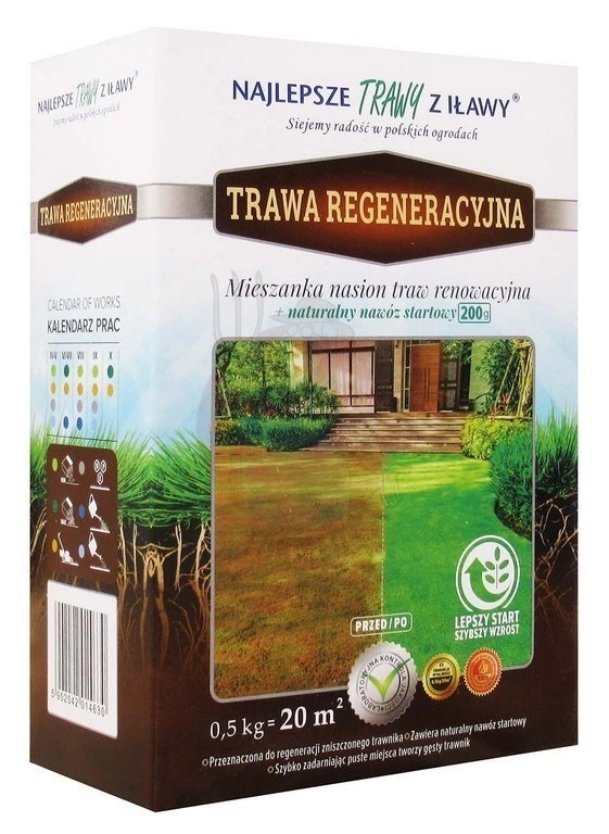 - Mieszanka nasion traw z naturalnym nawozem do regeneracji trawnika. Dobór najsilniejszych i najodporniejszych odmian traw sprawia, iż jest idealna do uzupełnienia powstałych ubytków w trawniku jak i do odnowy istniejącego już zniszczonego trawnika.