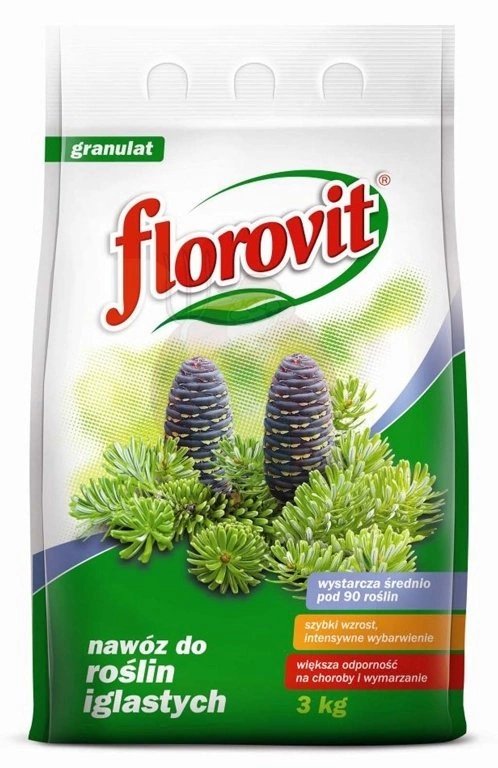 Florovit do roślin iglastych zawiera składniki mineralne w ilościach odpowiadających zapotrzebowaniu ozdobnych roślin iglastych takich jak cis, modrzew, cyprys, świerk, sosna, jodła i inne.