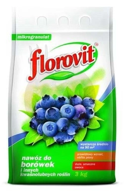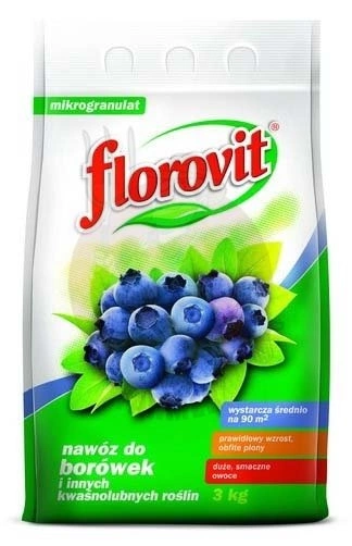 Wieloskładnikowy, mineralny nawóz doglebowy, przeznaczony do pogłównego dokarmiania borówek w pierwszym roku po posadzeniu i w dalszych latach uprawy. Ważną zaletą Florovitu do borówek jest zdolność zakwaszania gleby, co wyraźnie sprzyja wzrostowi i rozwojowi roślin wymagających stanowiska o niskim odczynie podłoża. Cechuje go również brak azotanów. Borówki sadzi się jesienią w podłoże o pH 3,8 - 4,8. Rośliny uprawiane w podłożu o zbyt wysokim odczynie charakteryzują się małymi przyrostami oraz przedwczesnym żółknięciem i opadaniem liści. Nawóz zapobiega chlorozie liści w okresie wegetacji roślin. Ponadto zastosowano w nim słabo przemieszczające się w glebie formy składników pokarmowych, co zabezpiecza je przed wymywaniem do wód gruntowych.