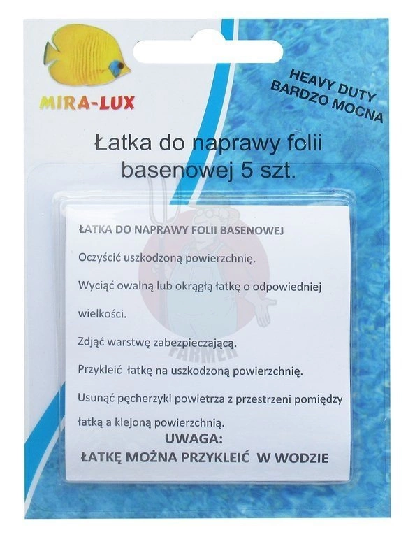 - Łatka do naprawy linera Heavy Duty opracowana jest specjalnie do łatania nieszczelności w folii winylowej. Łatkę można przykleić w wodzie.