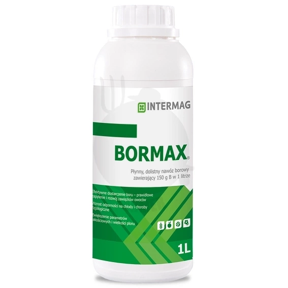 • Bormax to płynny nawóz dolistny zawierający 150 g boru (B) w 1 litrze w formie boroetanoloaminy, dzięki czemu jest szybciej wchłaniany, przemieszczany i przyswajany przez rośliny niż bor dostarczany roślinom w innych formach.