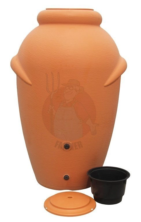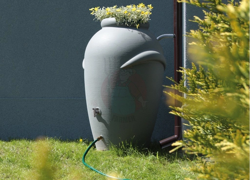 Zbiornik wyposażony jest w górny otwór z pokrywą, dwa miejsca do przymocowania rur spustowych z rynien oraz dwa otwory gwintowane na kran lub węża ogrodowego na szybkozłączkę.