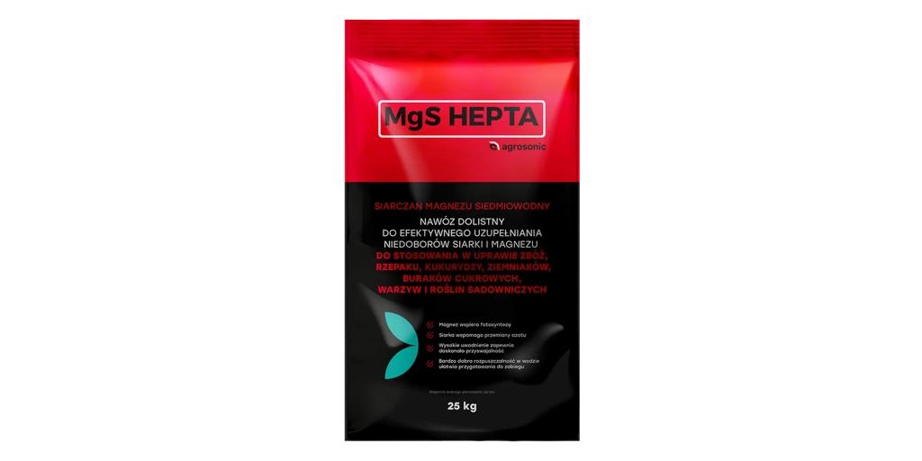 Siarczan magnezu HEPTA to nawóz dolistny w formie wysoko uwodnionej soli – heptahydratu siarczanu magnezu (MgSO₄·7H₂O) – przeznaczony do szybkiego i skutecznego uzupełniania niedoborów magnezu i siarki w uprawach polowych, warzywniczych i sadowniczych. Dzięki wyjątkowej rozpuszczalności i wysokiej zawartości składników pokarmowych nawóz działa błyskawicznie i może być stosowany zarówno w nawożeniu dolistnym, jak i do fertygacji.