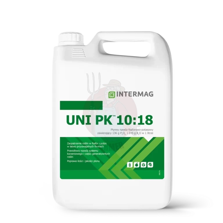 UNI PK 10:18 to płynny nawóz zawierający fosfor i potas (136 g P2O5 i 245 g K2O w 1 litrze) w formach łatwo dostępnych dla roślin. Stosowany nalistnie w zabiegach dokarmiania dolistnego szybko dostarcza roślinom fosfor i potas.
