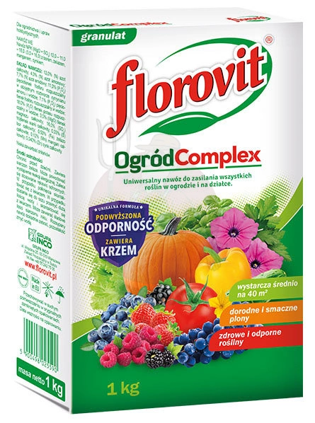 Florovit nawóz Ogród Complex zawiera krzem oraz składniki pokarmowe w odpowiednich proporcjach niezbędnych do prawidłowego wzrostu i rozwoju drzew i krzewów owocowych, warzyw oraz roślin ozdobnych.