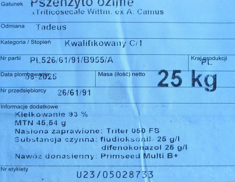 Pszenżyto ozime Tadeus nasiona kwalifikat C1