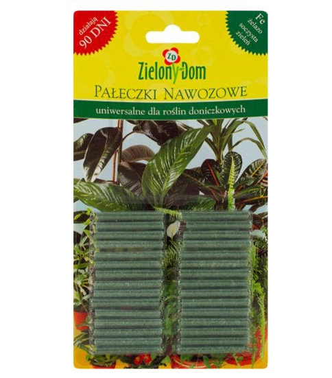 - Uniwersalne pałeczki nawozowe Zielony Dom to wygodne i długodziałające rozwiązanie dla roślin doniczkowych. Uwalniają składniki pokarmowe stopniowo przez 90 dni, wspierając zdrowy wzrost i bujne ulistnienie. Idealne do kwiatów domowych i balkonowych.
