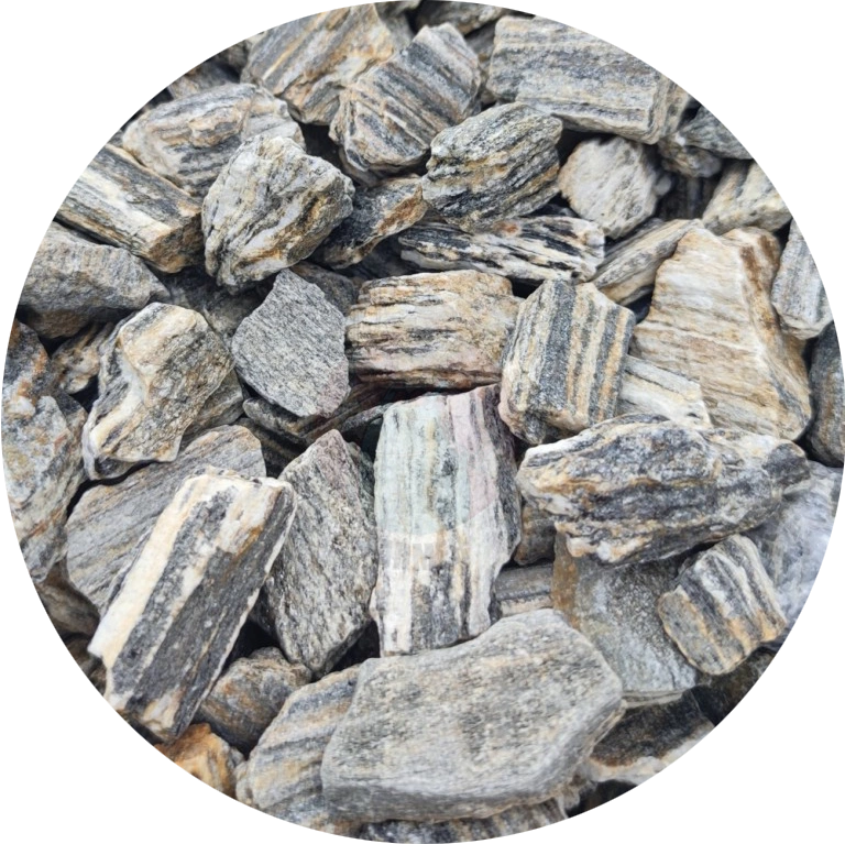 Kora kamienna naturalnego pochodzenia, to gnejs w kolorze brązowo żółtym z delikatnie mieniącymi się złotymi niteczkami. Kształtem oraz fakturą przypomina barwę kory sosnowej. Produkt świetnie sprawdza się jako materiał ściółkujący pod drzewami, krzewami oraz żywopłotami.