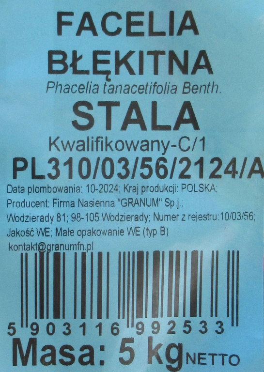 Facelia błękitna Stala to jednoroczna roślina o krótkim okresie wegetacyjnym wynoszącym 90–110 dni, w zależności od warunków pogodowych. Odmiana ta charakteryzuje się dobrym plonowaniem, wysoką wartością miododajną oraz wszechstronnym zastosowaniem w rolnictwie, zarówno jako roślina paszowa, poplonowa, jak i fitosanitarna. Jest również ceniona za szybki wzrost, odporność na choroby oraz zdolność do ograniczania występowania mątwika burakowego w glebie.